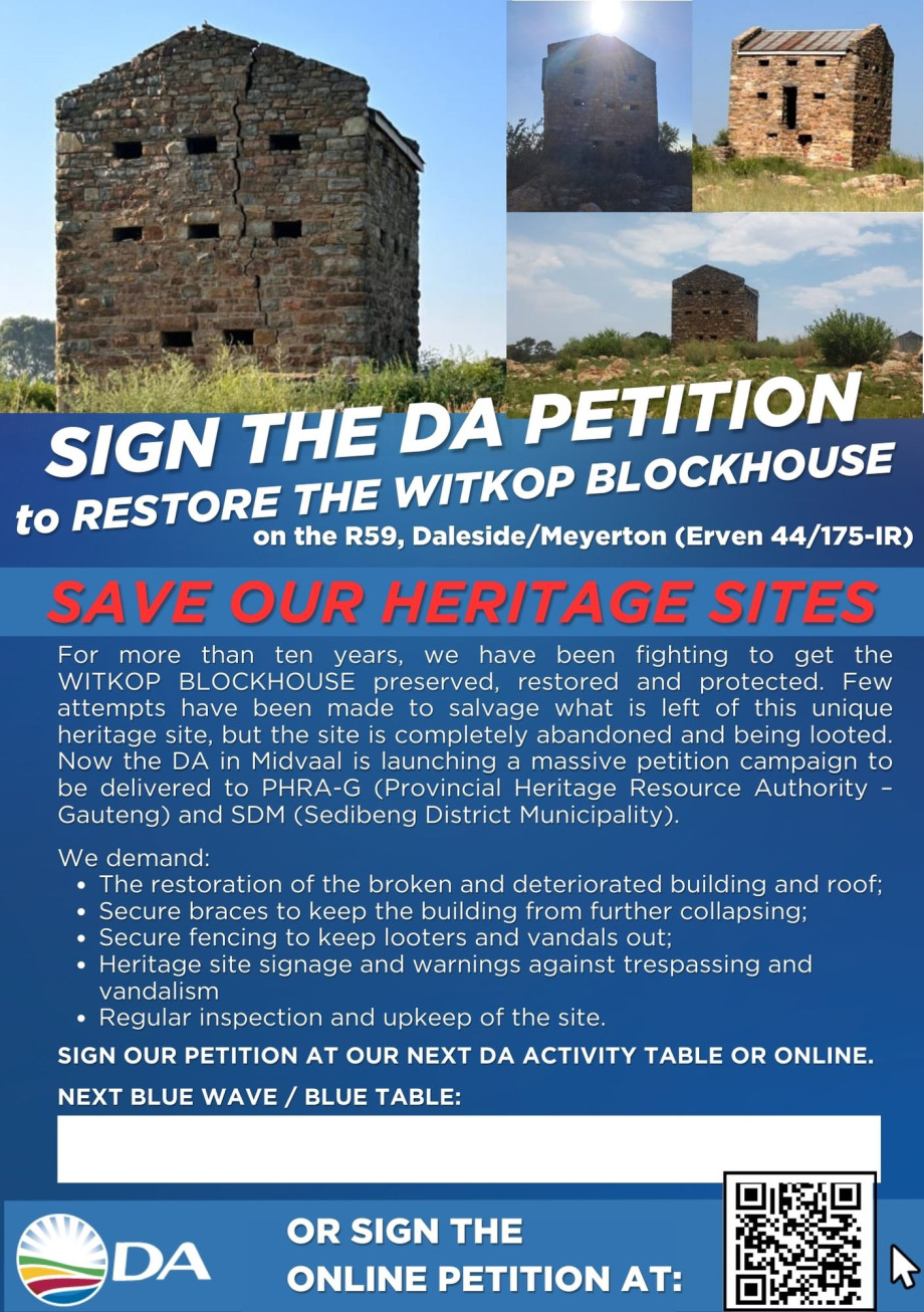 For more than ten years, we have been fighting to get the WITKOP BLOCKHOUSE preserved, restored and protected. Few attempts have been made to salvage what is left of this unique heritage site, but the site is completely abandoned and being looted. Now the DA in Midvaal is launching a massive petition campaign to be delivered to PHRA-G (Provincial Heritage Resource Authority – Gauteng) and SDM (Sedibeng District Municipality).