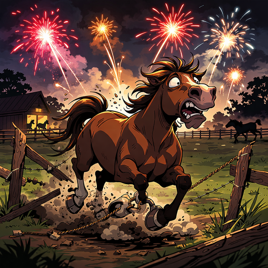 Horses are prey animals with a strong fight-or-flight instinct. Sudden loud noises and bright flashes from fireworks can cause extreme fear and blind panic, leading horses to bolt, crash into fences, injure themselves, or harm handlers. The sight and sound of fireworks are not just startling — they can be genuinely traumatic for horses kept in close proximity.